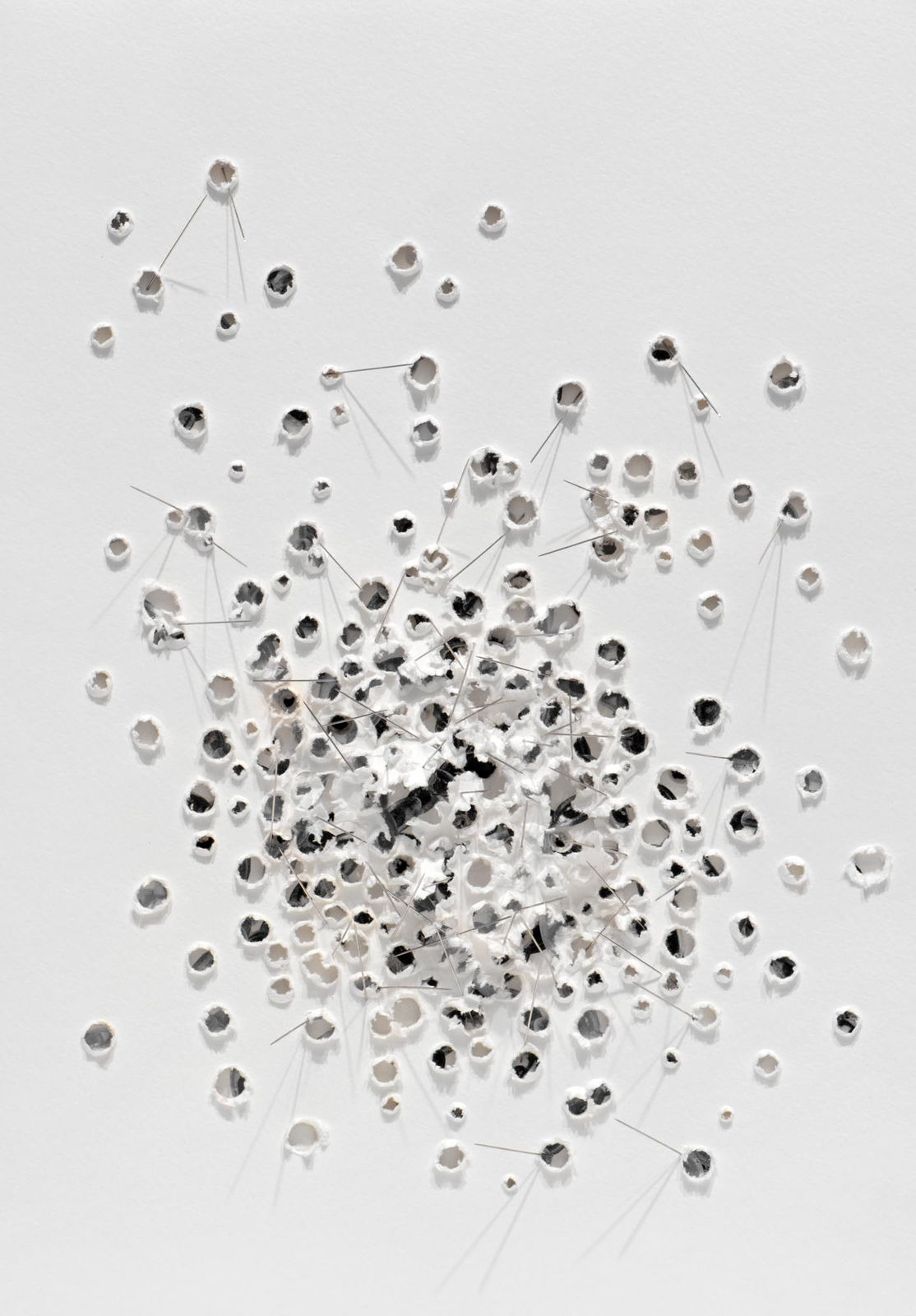Dans cette exposition, sous forme d’un solo show, Safaa Erruas poursuit la voie sur laquelle elle construit son univers plastique depuis plus de vingt ans : l’univers blanc où fragilité et force tranchante entretiennent une lutte sans merci. L’admirable dans cette œuvre, c’est que la conjonction d’espaces fragiles et d’éléments inquiétants ne met jamais en péril l’équilibre de l’œuvre qui impose toujours sa présence.